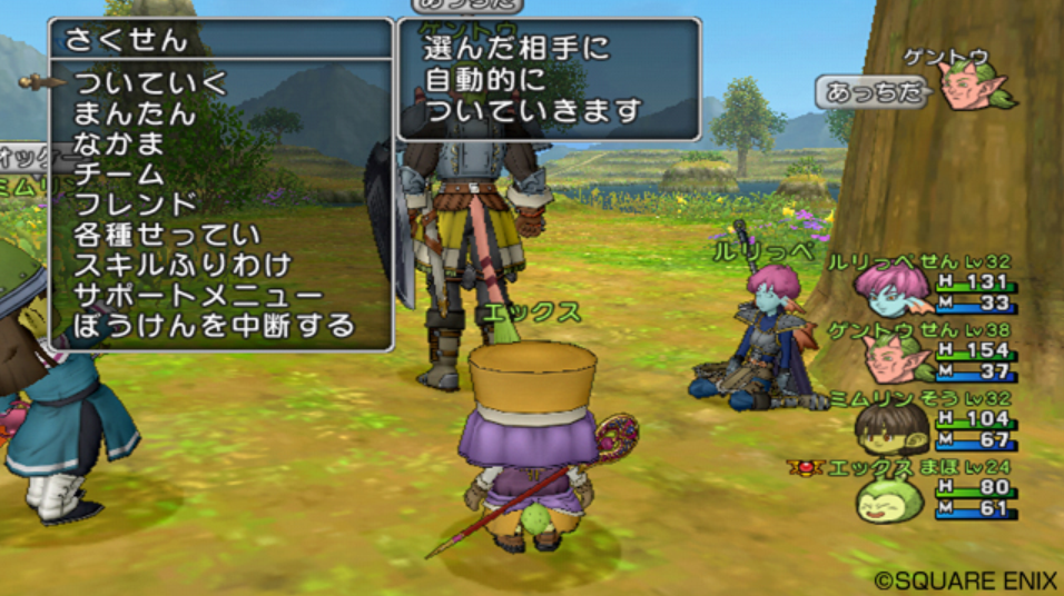 PTでの移動中、フィールドなどではぐれないよう、先行するキャラクターを自動追従する機能で、転生や宝珠探索によく使われる。
