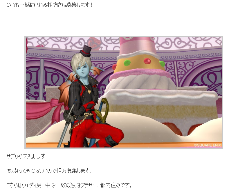いるんですよ、相方プレイをしたいがために新しいキャラを作るなんつう方々が…。